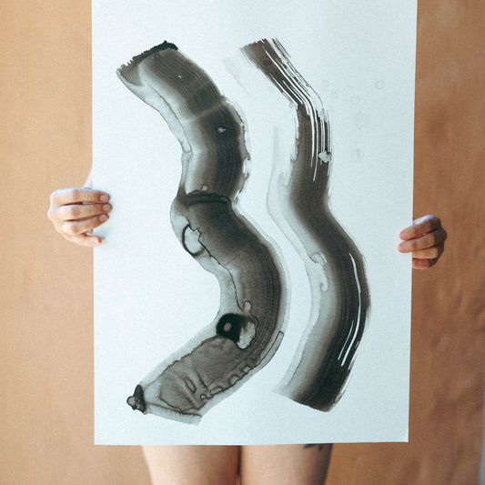 Painting with ink, with jars of water. Pouring both onto the paper and moving. Drying and layering. Big broad strokes as I move my arms. In black and in white, and in soft sepia tones of the past and of the forest. The piecing together of a story.