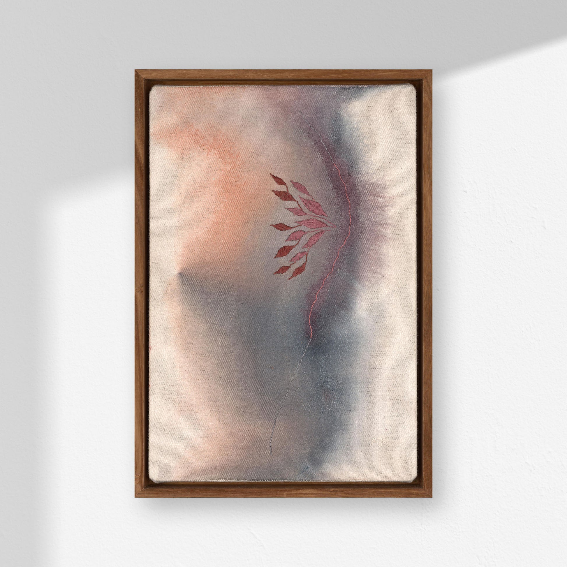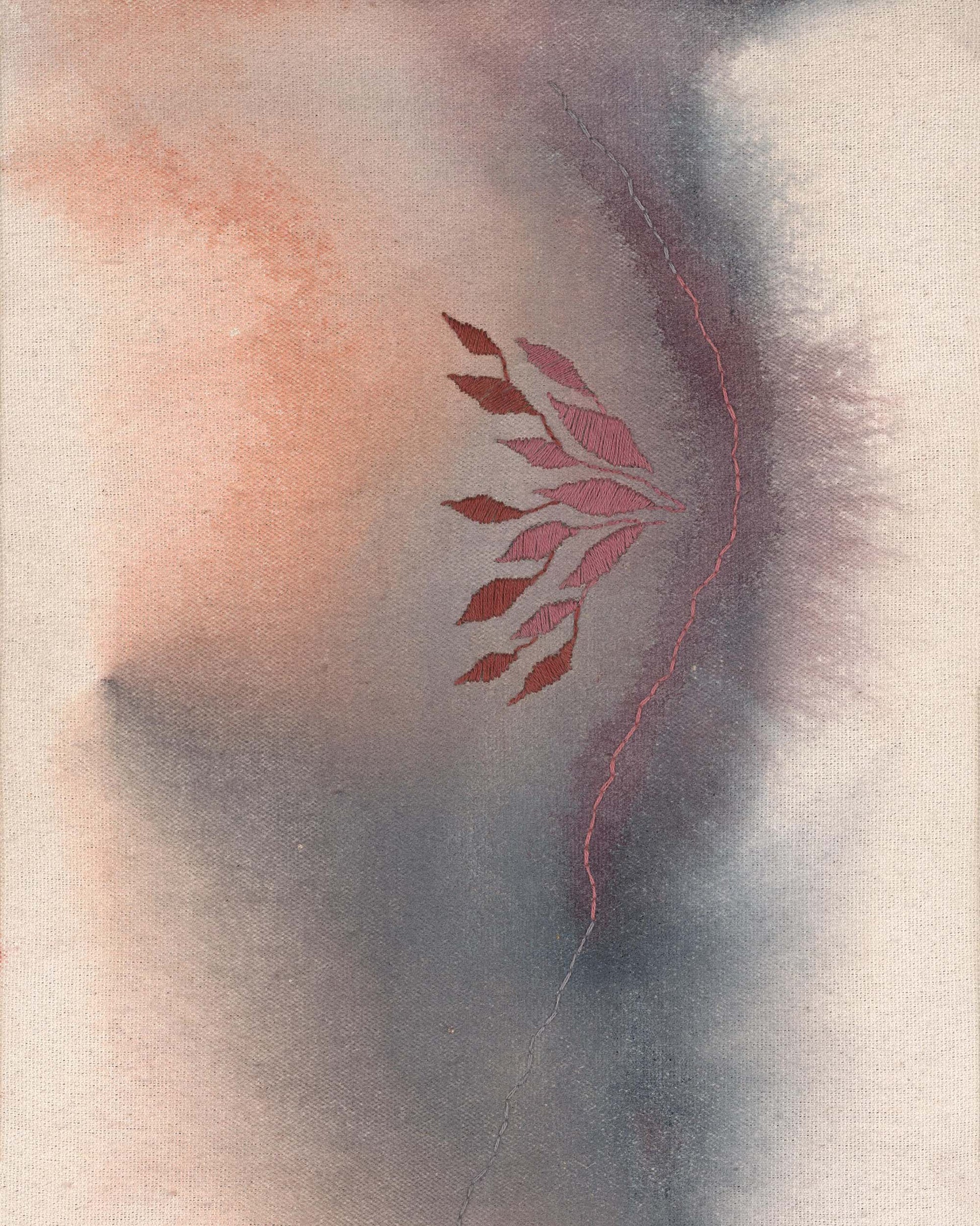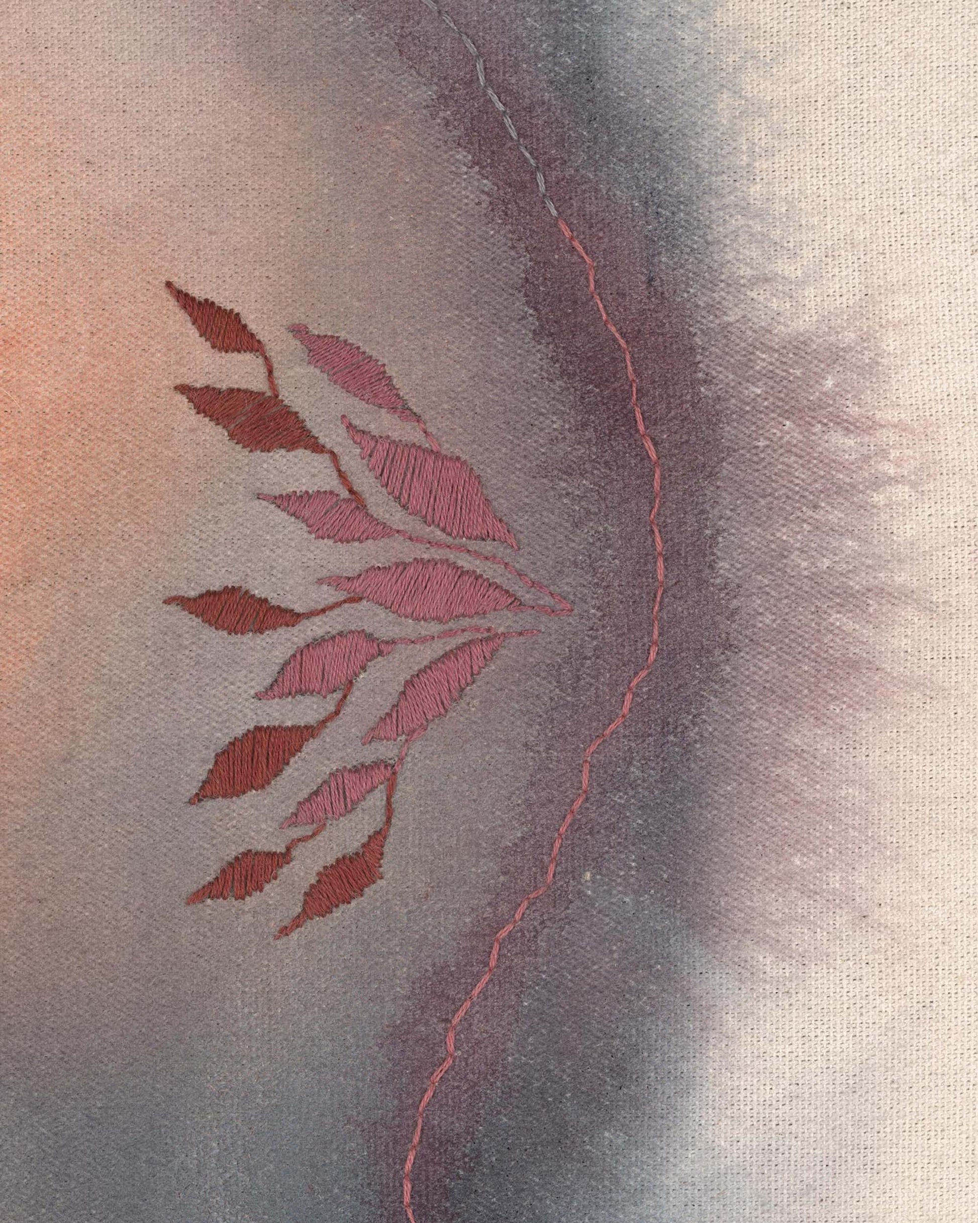 The ink seeps into raw canvas like memory, like weather. A form appears, a stitched shell, a mountain emerges from the thread. These pieces unfolded slowly over months, never rushed - just like the questions that live beneath them.